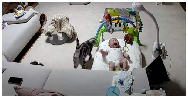 В корейском городе Кимпхо на камеру наблюдения в квартире попал забавный момент. Кошка подбежала к плачущему младенцу и смогла его успокоить.