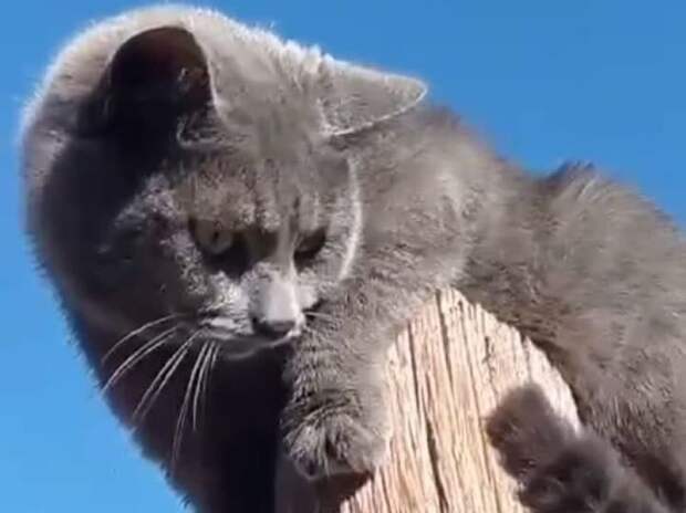 Хозяева обнаружили питомца на столбе и вызвали экстренную службу. Один из сотрудников, используя монтерские когти, снял пушистого и вернул его на землю.