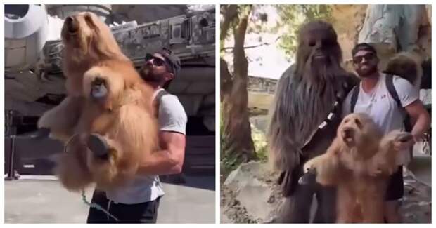 Пёс по кличке Броди, очень похожий на Чубакку из «Звездных войн», отправился вместе с хозяином в тематический парк развлечений. Там они разыскали «звездного папашу» пса.