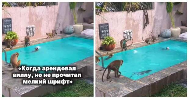 Гости сняли дешевое жилье на острове, не прочитав мелкий шрифт в договоре. В итоге задний двор с бассейном полностью занят обезьянами: они плескаются в воде, отдыхают и чувствуют себя как дома.