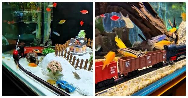 Мастер взял обычную игрушечную модель, полностью изолировал электронику от воды и подключил её к беспроводной зарядке, проложенной вдоль дна аквариума.