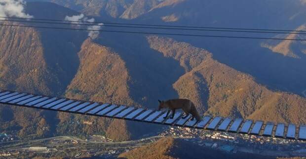 На одном из горных курортов Сочи лиса прошла по подвесному мосту на высоте 2200 метров. Передвижение рыжей экстремалки попало на видео очевидцев.