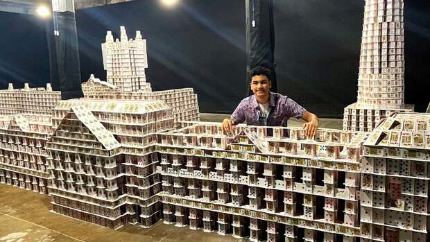 15-летний индийский подросток Арнав Дага стал обладателем мирового рекорда. Школьник потратил 143 тысячи игральных карт на создание нескольких известных сооружений своего родного города.