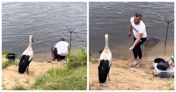 Аист пришёл к рыбаку за рыбкой. Кого только не встретишь на рыбалке!