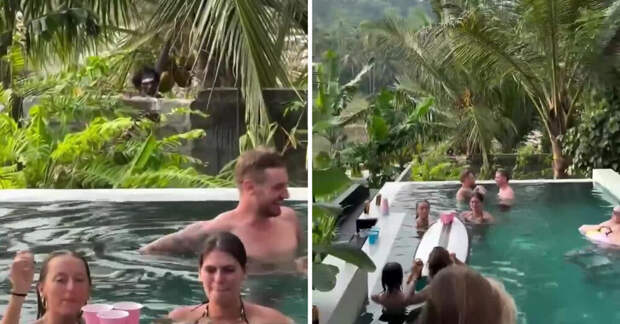 Туристы купаются и наслаждаются отдыхом на пляже, не подозревая, что за забором за ними наблюдает представитель местного первобытного племени.