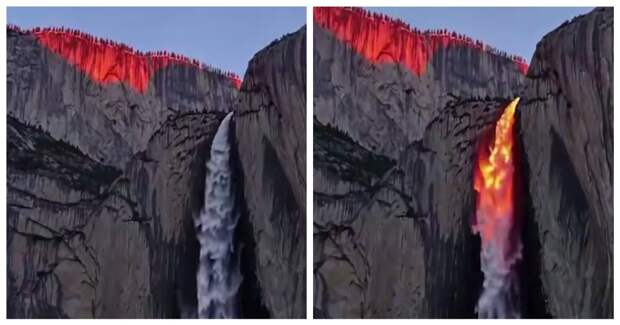 В Йосемитском национальном парке в Калифорнии есть водопад именуемый "Лошадиным хвостом". Всего нескольких дней в году у посетителей парка появляется возможность увидеть здесь редкое явление. Водный поток становится похож на извергающуюся из вулкана лаву.