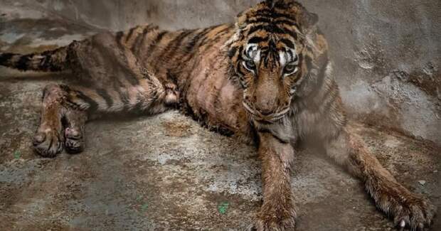 Тигрица, превратившаяся от голода в кожу и кости, стала одной из 15 диких кошек, которых спасли из зоопарка в Мукдахане, на севере Таиланда. На ужасающих кадрах истощённая Саламас лежит на грязном бетоне и едва может подняться.