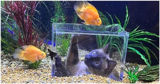 Котики наблюдают за рыбками в аквариумах со специальным вырезом и не только.
