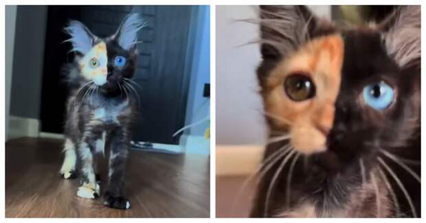 В сети прославился котёнок с редким окрасом. Мордочка пушистого разделена на рыжую и чёрную половины, а его глаза разного цвета из-за гетерохромии.