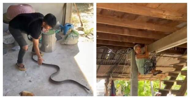 Бабушка увидела змею, заползшую в её дом и позвала на выручку зятя. В какой-то момент змея вырвалась и пожилой женщине пришлось полагаться только на свои силы.