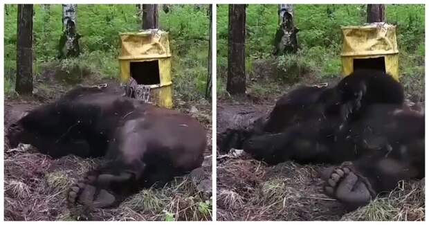 Фотоловушка запечатлела медведя, отдыхающего в Дмитровском районе Подмосковья. Косолапый почесался и перевернулся на другой бок.