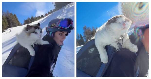 Кошка обожает кататься на сноуборде вместе с хозяйкой. Девушка публикует в сети видео, на которых она вместе с кошкой за спиной покоряет снежные склоны.