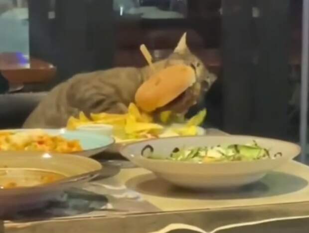 Кот похитил бургер на глазах у посетителей ресторана и отправился искать укромное место для трапезы.