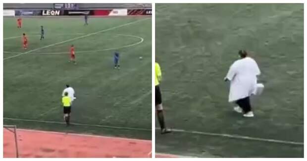 Пока женщина шагала по полю пострадавший игрок встал на ноги.