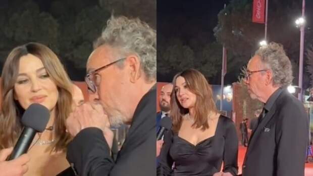 Режиссёр Тим Бёртон на видео смотрит на Монику Беллуччи не отрываясь и целует ей руку. Гуру мистических сюжетов, готических элементов и чёрного юмора в кино кажется зрителям влюблённым подростком, готовым ради актрисы на всё.
