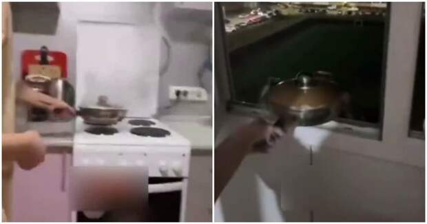 У девушки возникли некоторые проблемы во время приготовления блюда на плите. Она вышла со сковородой на балкон и чуть не устроила пожар.