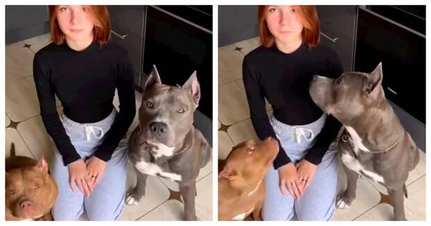 Автор видео вместе с девушкой по имени Настя пытаются научить собак команде "голос".