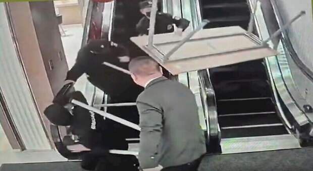 Камера наблюдения, установленная в торговом центре в Китае, запечатлела трагикомичный инцидент. Охранники торгового заведения спускали столы на эскалаторе, как вдруг один из столов застрял на выходе.