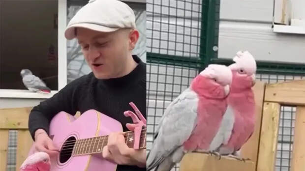 Парень с гитарой решил устроить импровизированный концерт для нескольких попугаев. Музыкальный номер пришёлся пернатым по вкусу.