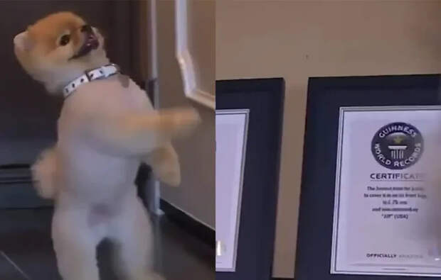 Милый пёс пробежал 10 метров на задних лапах за несколько секунд, установив новый рекорд. Достижение было официально зафиксировано в Книге рекордов Гиннеса.