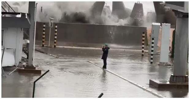 Мужчина, по всей видимости, решил сделать фото или видео для отчёта начальству после недавнего шторма. Однако большая волна спутала его планы.