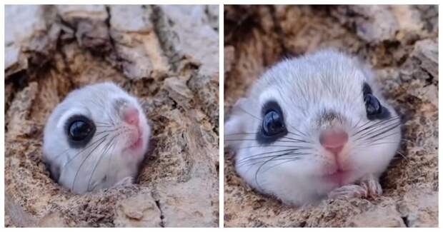 На острове Хоккайдо фотографу удалось запечатлеть редкого и невероятно милого обитателя северных лесов — эдзо-момонгу, подвид белки-летяги. Это крошечное создание с огромными чёрными глазами, округлым тельцем и пушистым мехом выглядит словно живая плюшевая игрушка.