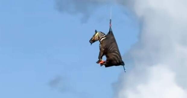 Неделю по всему штату Теннесси искали зебру. На видеозаписях запечатлён момент, как беглеца поднимают в воздух на вертолёте.