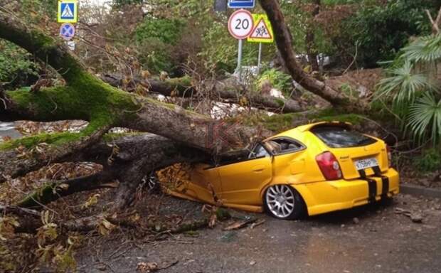 Инцидент произошёл в Хостинском районе Сочи. Ураганный ветер свалил огромное дерево на припаркованный автомобиль. Чрезвычайное происшествие случилось рядом со школой в микрорайоне Бытха. К счастью, в результате происшествия никто не пострадал – в момент падения дерева в салоне авто никого не было.