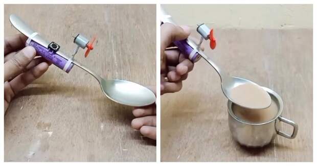 Мужчина сделал ложку с "пропеллером" для тех, кто не любит ждать. По задумке чудака "пропеллер" будет остужать горячую пищу или напиток потоком воздуха.