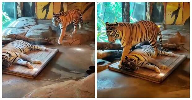 Взаимоотношения животных в дикой природе часто напоминают человеческие. Яркий пример сцена, где один тигр "подвинул" другого с нагретого места.