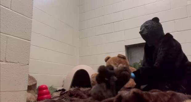 В Центре дикой природы Рамона в Калифорнии сотрудники Общества защиты животных пошли на необычный шаг, чтобы обеспечить благополучное восстановление двухмесячного черного медвежонка — они начали ухаживать за ним, надев специальные костюмы, имитирующие внешность взрослого медведя.