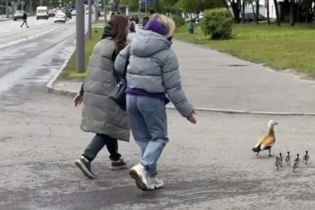 В Москве пешеходы увидели, как огарь пытается перейти проезжую часть с птенцами и решили помочь.