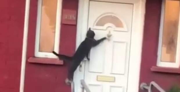 Коты звонят и стучат своими лапами в дверь, чтобы хозяева поскорее открыли и впустили их.