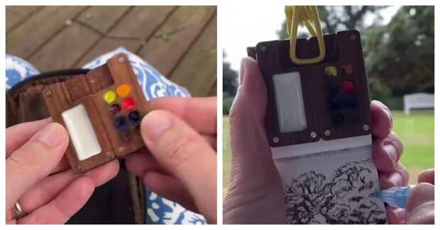 Пользователь сети показал, как выглядит карманный мольберт с красками. Полезная вещь для тех, кто любит рисовать на свежем воздухе.