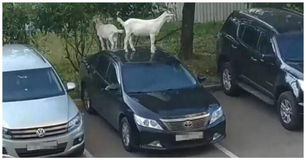 В Москве козы уже несколько лет докучают жителям района Южное Бутово. Автомобильный регистратор запечатлел недавно банду рогатых, лазающих по припаркованной машине.