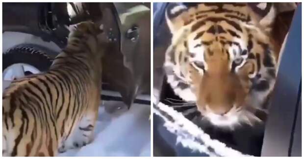 Тигры залезли в машину к хорошо знакомому им мужчине и прокатились с ветерком.