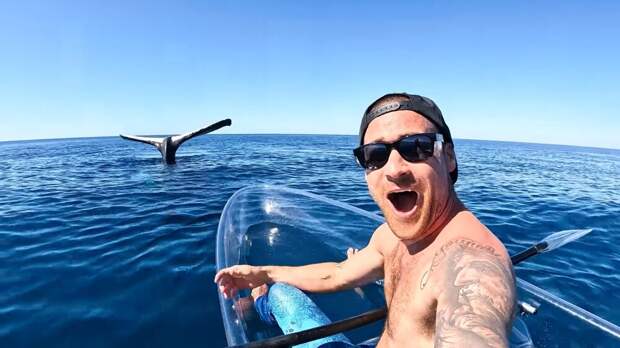Австралийский блогер Броди Мосс заснял уникальный момент, плавая на каяке в океане. Он внезапно увидел хвост огромного горбатого кита, который торчал из воды — а затем заснял и самого кита под водой. Удивительная встреча!