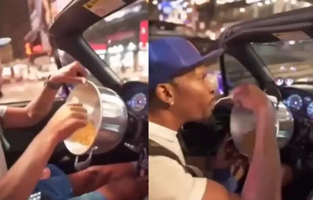 Любитель перекусить в дороге использовал кастрюлю в качестве руля.