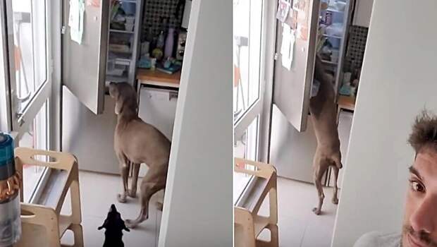 Житель Португалии подкараулил хитрых питомцев возле холодильника и запечатлел похождения своих домашних животных.