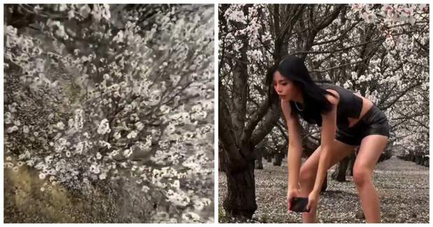 Девушка предлагает взглянуть на цветущий вишнёвый сад с неожиданного ракурса. Одобряете такой креатив?