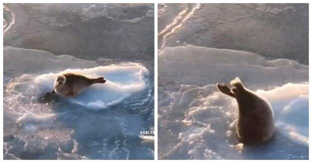 Малютка тюлень испугался дрона и попытался смыться в прорубь. Вышло не с первого раза.