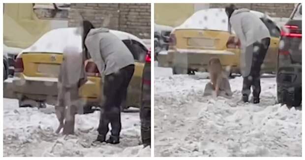Девочка провинилась перед суровой родительницей, после чего та провела жестокие воспитательные работы прямо на улице