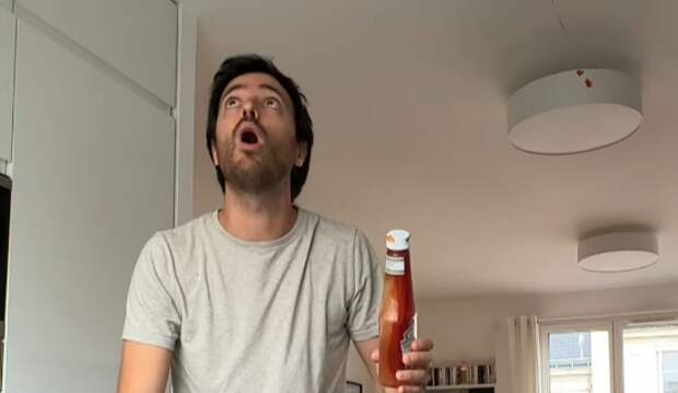 Не все советы из интернета одинаково полезны. Житель Парижа подсмотрел в интернете лайфхак, который помогает добраться до остатков кетчупа на дне бутылки. Он повторил хитрость и случайно разбрызгал соус повсюду.