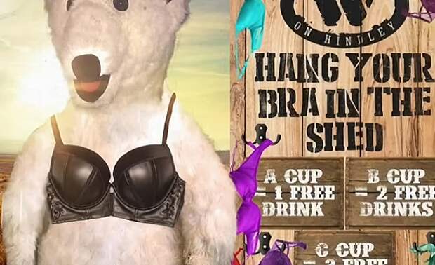 В ночном клубе Woolshed в Аделаиде было начато расследование после проведения акции «Сними лифчик и расслабься». Посетительницам предлагался бесплатный алкоголь в обмен на их бюстгальтеры, и размер имел значение: чашка «A» — один напиток, «B» — два напитка, «C» — три напитка и так далее.