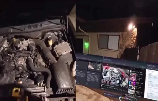 Владелец машины, используя очки дополненной реальности, одновременно выполняет несколько задач: читает инструкцию, смотрит обучающее видео и ведёт с кем-то беседу в социальных сетях.