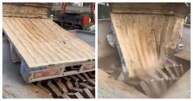 Демонстрация работы промышленного шредера. Машина с легкостью справляется с предметами из металла и не только.