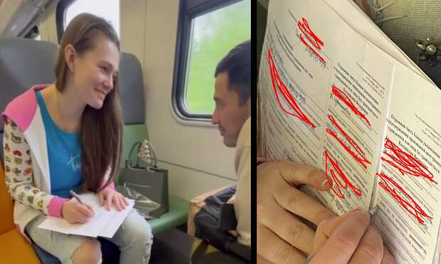 В подмосковной электричке на станции Дмитров пассажир снял необычную сцену: девушка заполняет документы для мигранта из Таджикистана, который едва говорит по-русски.