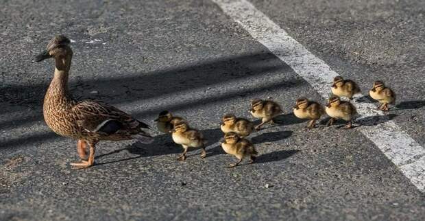 Утка переходила дорогу вместе со своим выводком. Неожиданно утята один за другим начали проваливаться в ливневую канализацию. К счастью, рядом оказались неравнодушные люди.
