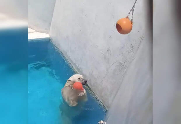 Сотрудники зоопарка придумали для хищника развивающее задание: чтобы достать вкусняшку из подвешенной корзины, медведю нужно забросить туда предмет. Зверь быстро понял правило и теперь с лёгкостью выполняет точные броски.