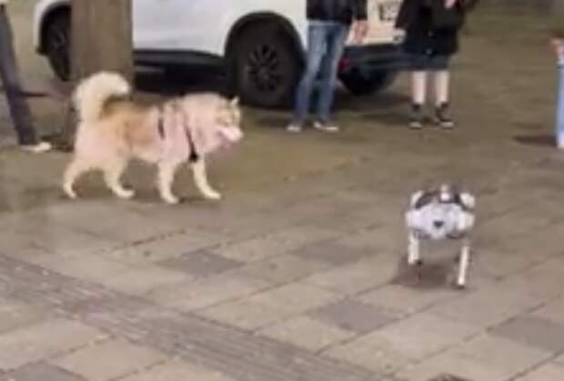 Собаки встретили робопса на улице во время прогулки. Животные проявили к роботу повышенный интерес.
